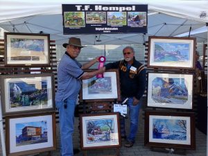 “Vander Veer Park Duck Lagoon” is a dreamy lagoon scene with reflections in the water painted beautifully. “Taco Mexico” makes a cobbled street in a small town a joyful celebration of colour and character. “Lobster cove” gives an interesting feel to water which is rendered beautifully in shades of green with swirling shadows. The paintings are beautifully rendered to give a familiar feel to the subject, such as windmills, tractors and wagons, country and riverside trails, dramatic and beautiful harbour scenes, and commercial establishments which have been open for many years. “Our home” is a faithful depiction of Hempel's own home - a beautiful rustic cottage.