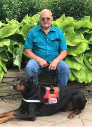 His first reaction on reading about PTSD was that he could “grow up and get over it.” Then, as he learned more about the symptoms shared by many vets, he began to accept the situation and the idea of a service dog. Hoch wanted the experience of training his service dog himself. When he began seriously considering it, he decided to go with his long-held admiration for Doberman Pinschers, and he found a breeder close enough to deal with. He also located Tails of Valor, an organization that works with shelter puppies and was willing to work with him and his new pup.