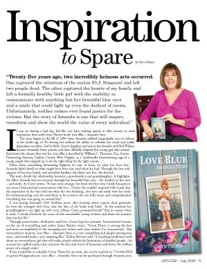 Love Blue: Amanda's Story by Gwyn Thorn is a heartrending true story of good and bad parenting, the reality and horror of child abuse, and the existence of divinity to make life possible in a good way. It is the story of a couple who wanted to do the right things guided by their faith, along with support from their families. Amanda's story had to be told and also how her existence changed many lives. The book chronicles Amanda's journey and gives readers a peek into her world and the value of her life. Amanda's horrifying experiences of physical and sexual abuse, and then being taken in by parents who loved her unconditionally and took care of her, keeping her physically and emotionally happy, is heartwarming and remarkable.